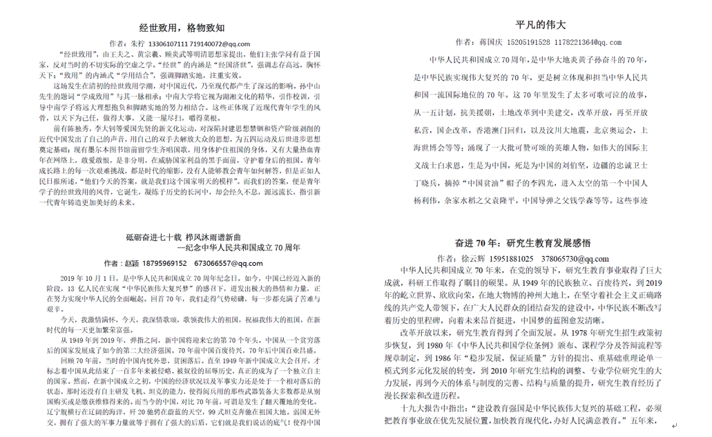 此次活动共收到三十余篇来稿,同学们的感恩报国之情从文字中溢出,渗入读者的心间。他们或高扬或沉稳,文笔之间字字真情流露。过去的中国已然成长,未来的中国将由这些年轻人接手,从父辈手中接过复兴的接力棒,我们准备好了!