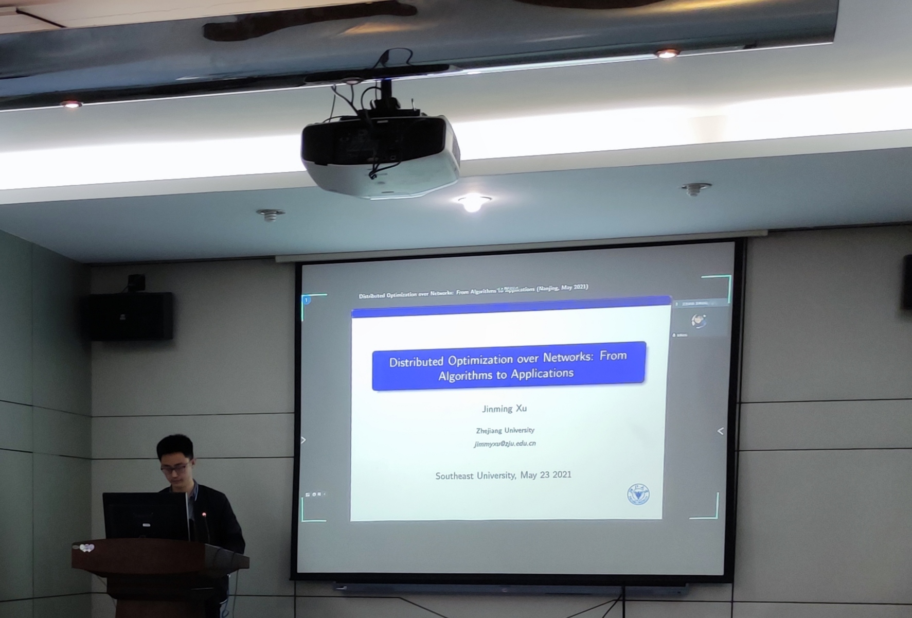 在论坛的第二场报告中,浙江大学徐金明研究员重点介绍了近期提出的几种新型分布式优化算法,并在此基础上讲解了分布式优化算法在多传感器信息融合、智能电网资源优化配置和分布式机器学习等诸多领域中的应用。