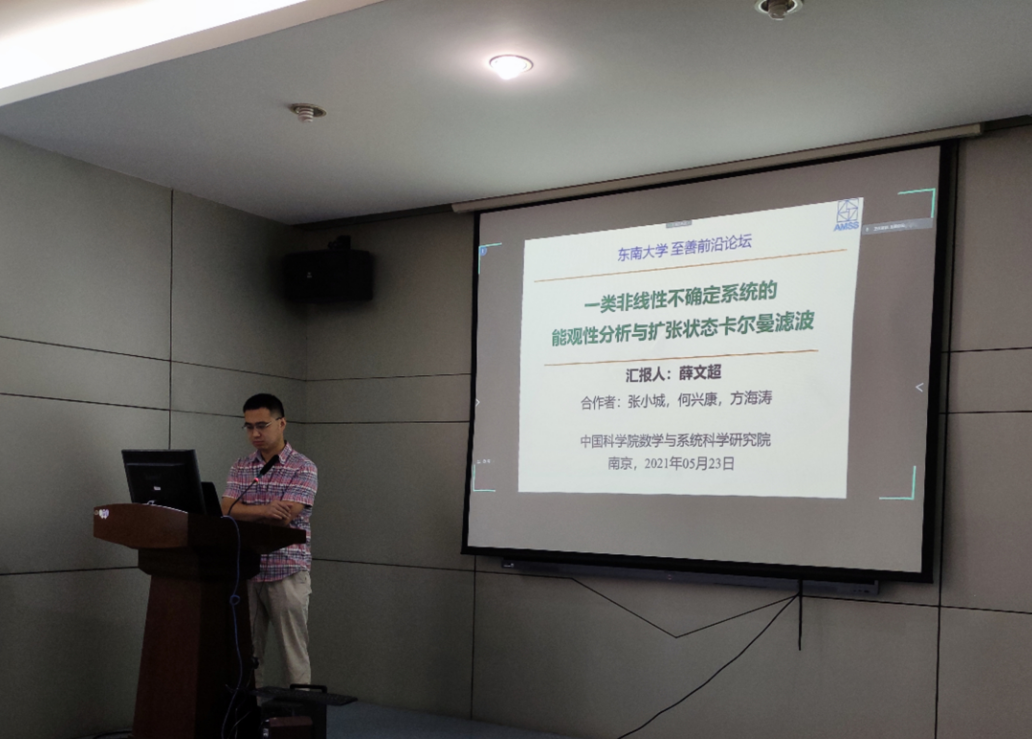 接下来作报告的是中科院数学与系统科学研究院薛文超副研究员。薛文超副研究员首先阐述了很多控制工程系统面临的共有问题——不确定系统的状态估计问题。并针对该问题,给出了扩张状态卡尔曼滤波的设计方法,并进一步介绍了分布式的扩张状态卡尔曼滤波及其特性。