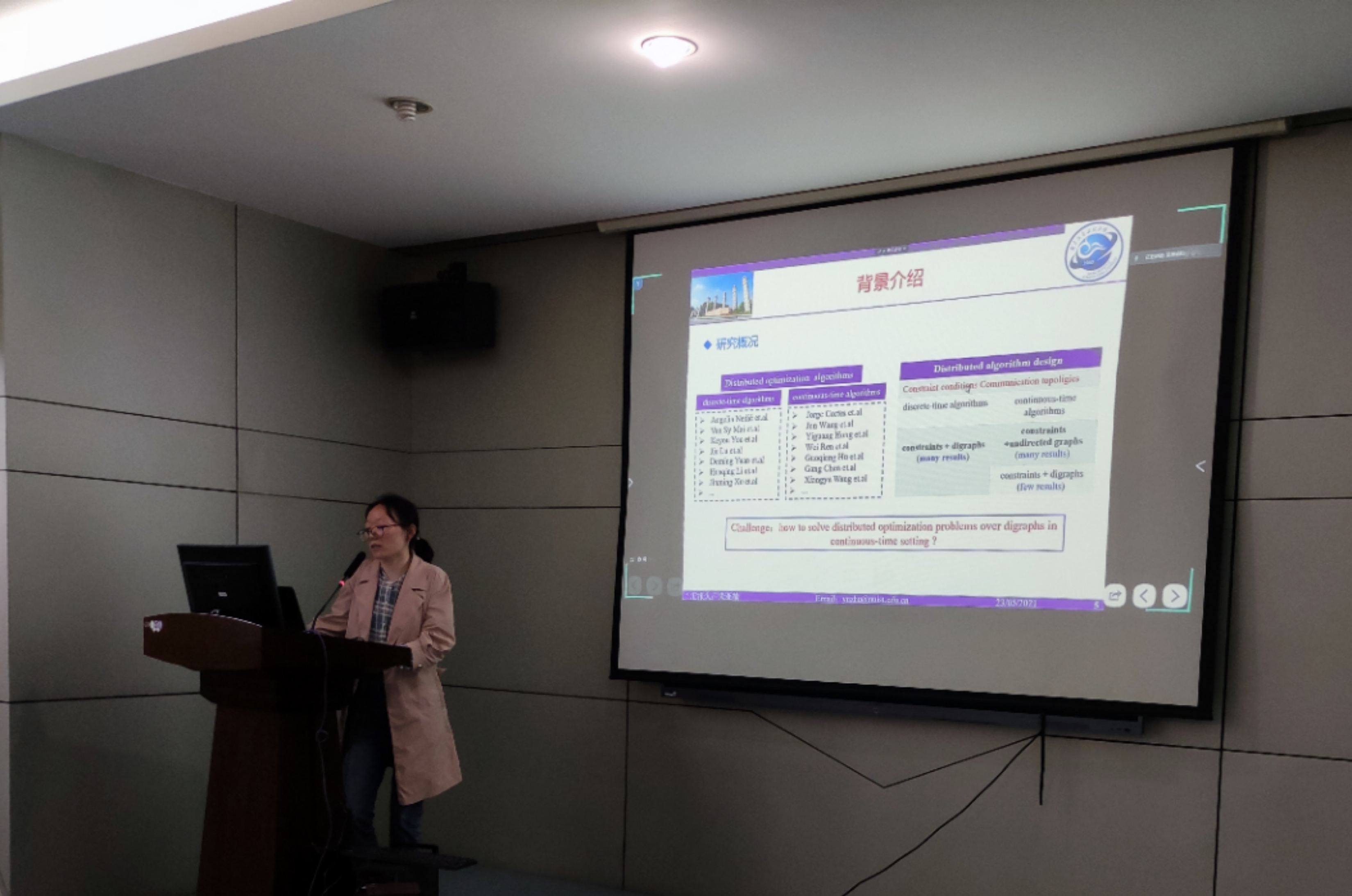 在论坛的第四场报告中,南京信息工程大学朱亚楠博士作了“有向图下分布式优化的算法设计与分析”的报告,朱亚楠博士首先阐述了图论和Fenchel对偶等相关知识,并在此基础上提出了基于双时间尺度的分布式优化算法。