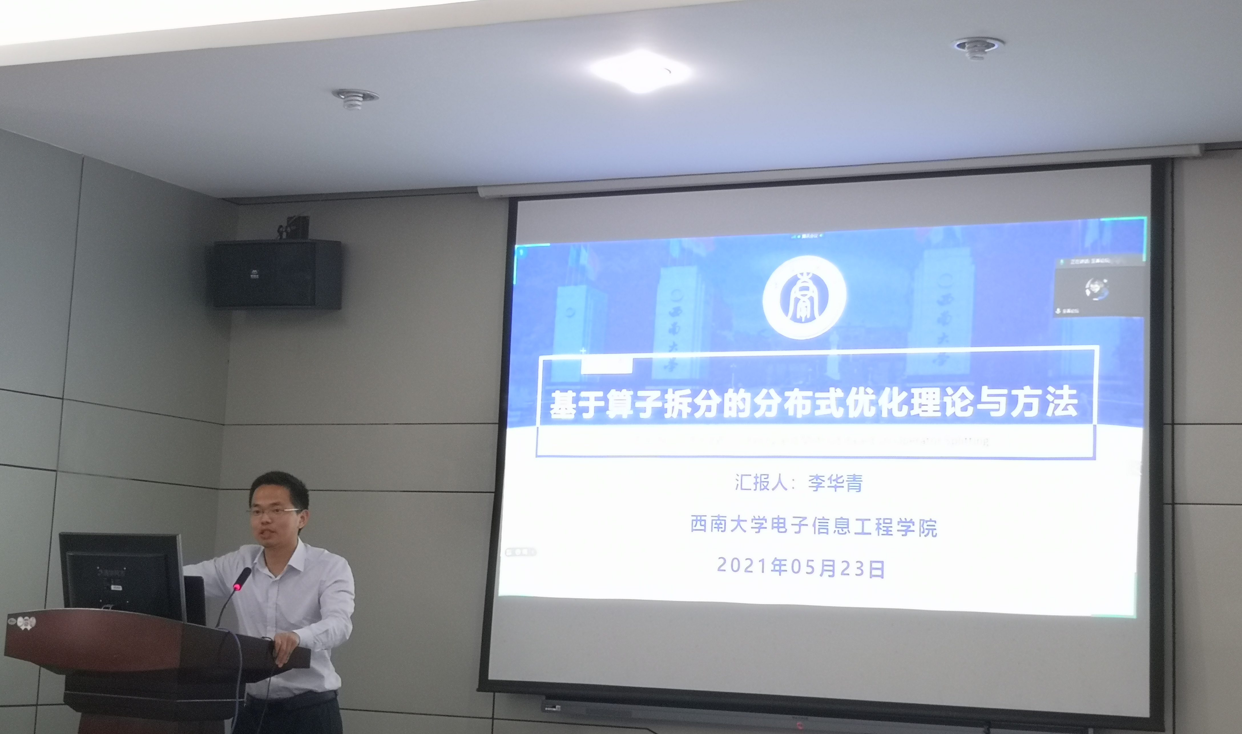 首先,西南大学李华青教授作了题为“基于算子拆分的分布式优化理论与方法”的报告,提出了基于算子拆分理论的分布式优化方法,并通过多机编队控制、电力系统动态经济调度、多车辆群集避撞等实际工程应用展示了所提分布式方法的性能。