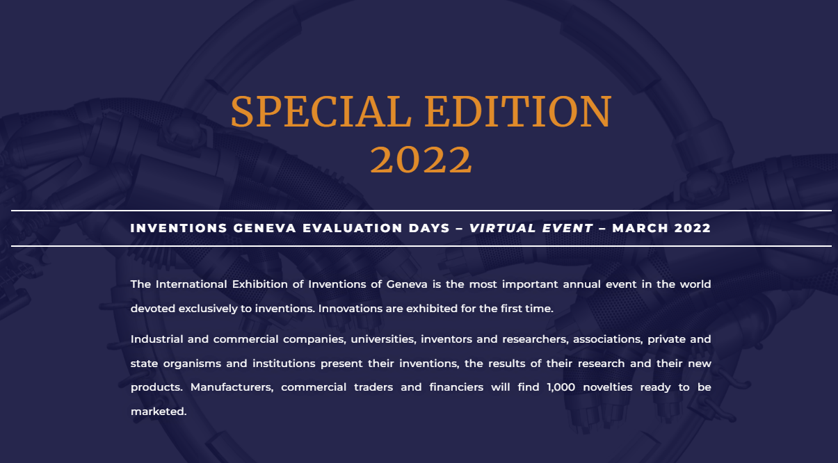 瑞士当地时间3月16日至3月20日,2022年第49届日内瓦国际发明展会如期举行,受疫情影响,以线上特别展方式进行。