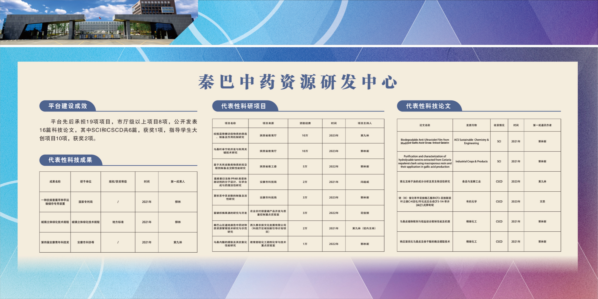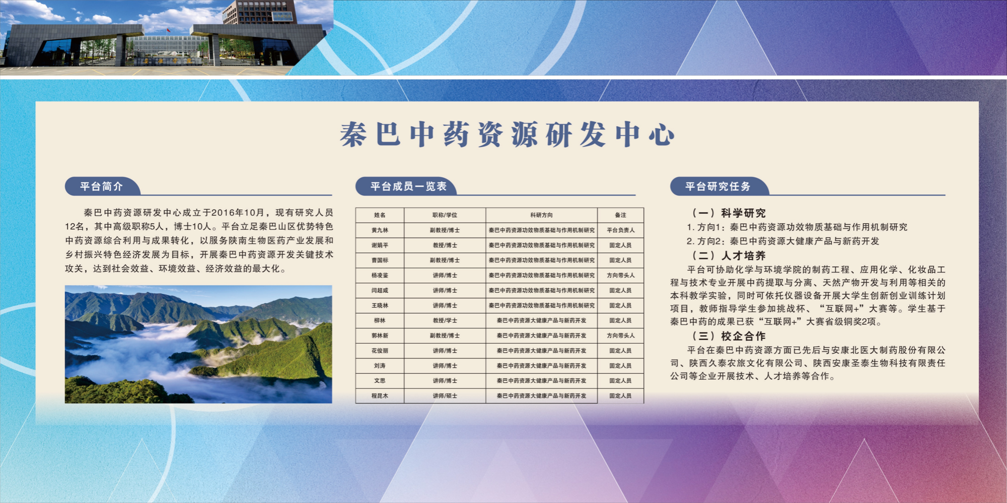 秦巴中药资源开发与应用创新团队拥有一支科研能力强、业务素质高的科研团队,其中教授1人、副教授2人、博士6人。近五年来,团队获陕西高等学校科学技术奖三等奖1项,安康市科学技术一等奖3项、二等奖4项,陕西省科技创新大赛三等奖1项,获安康市青年科技奖1项;1人入选陕西省“特支计划”区域发展人才。近五年获批各级项目30余项,总经费500余万元,在Industrial Crops & Products、RSC Advances、Bioorganic & Medicinal Chemistry Letters 等权威期刊发表论文30余篇,授权发明专利7件。指导大学生创新计划项目15项,其中国家级3项、省级6项,指导学生发表学术论文8篇。