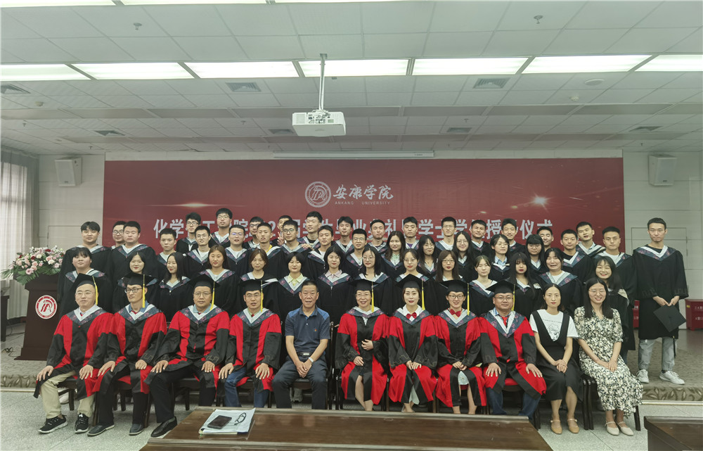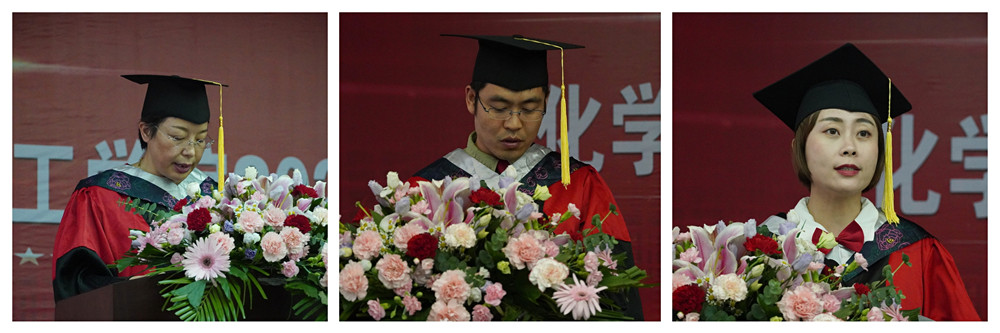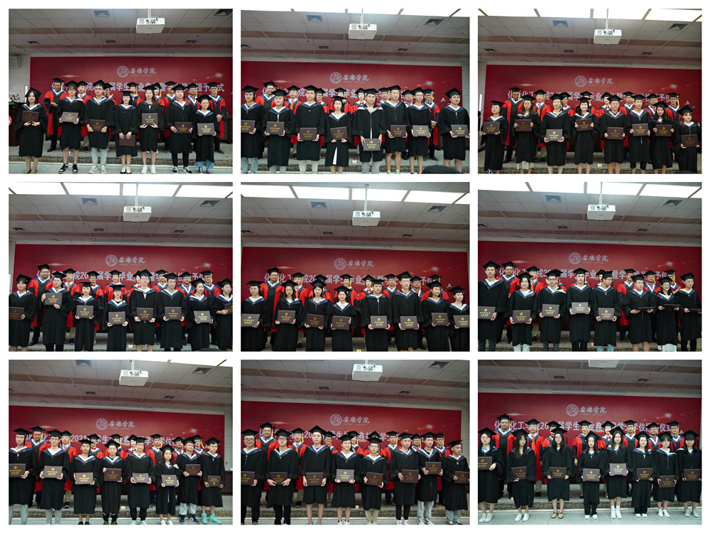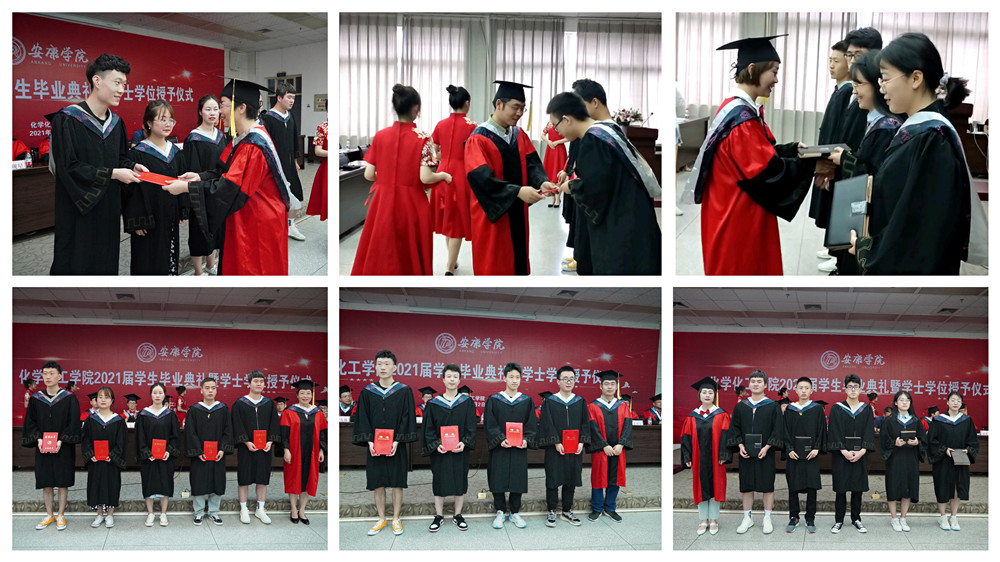 在全场热烈的掌声和欢快的音乐声中,化工学院对校级优秀毕业生和考研学生进行了表彰,并向2021届校友联络员颁发了聘书。柳林、袁光辉、黄婷等8位老师为获得学士学位的毕业生逐一拨穗,颁发学士学位证书,并合影留念。