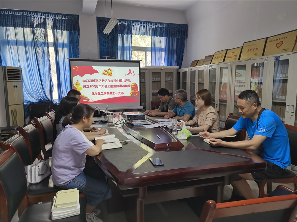 7月14日,化工学院教工一党支部召开学习会议,学习贯彻习近平总书记在庆祝中国共产党成立100周年大会、“七一勋章”颁授仪式上的重要讲话精神,深入解读中国共产党百年奋斗的光辉历程、伟大成就、宝贵经验和实践启示,以讲话精神为指导,阔步学院发展新征程。支部书记黄婷主持会议并讲话,教工一党支部党员参加了会议。