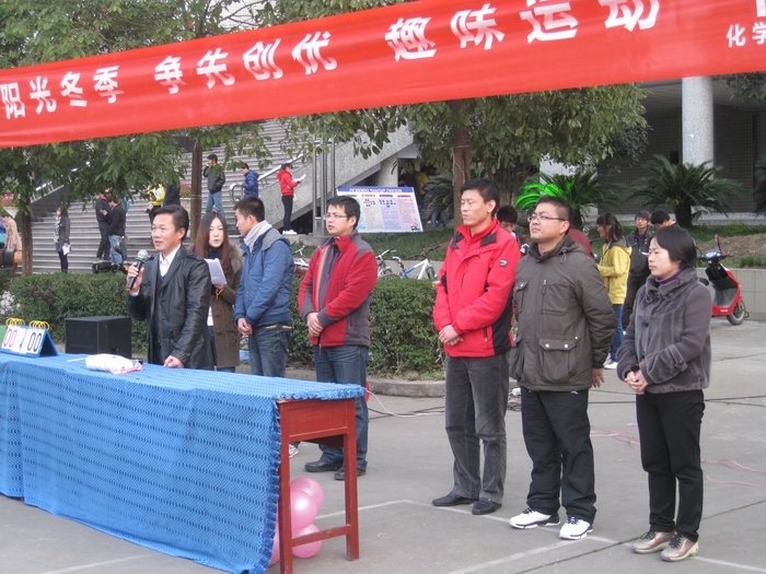 2011年12月9日下午4:00,我系在东校区前操场举行了“化学化工系2011年冬季趣味运动活动周”活动开幕式。出席本次活动的老师有化学化工系党总支书记张立虎,学工办主任韩晔,辅导员叶春辉、张建东和武立州、袁光辉等老师,系分会所有干部、干事以和全体大一新生参加了此次开幕式。