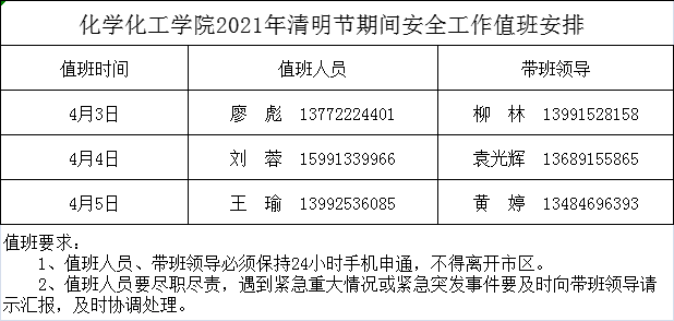 2021年清明节期间安全工作值班安排