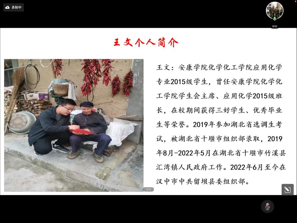 王文,2019届应用化学专业毕业生,在校期间担任班长、团总支学生会主席,获得校级三好学生、优秀学生干部、优秀毕业生等荣誉,现就职于汉中市留坝县委组织部。