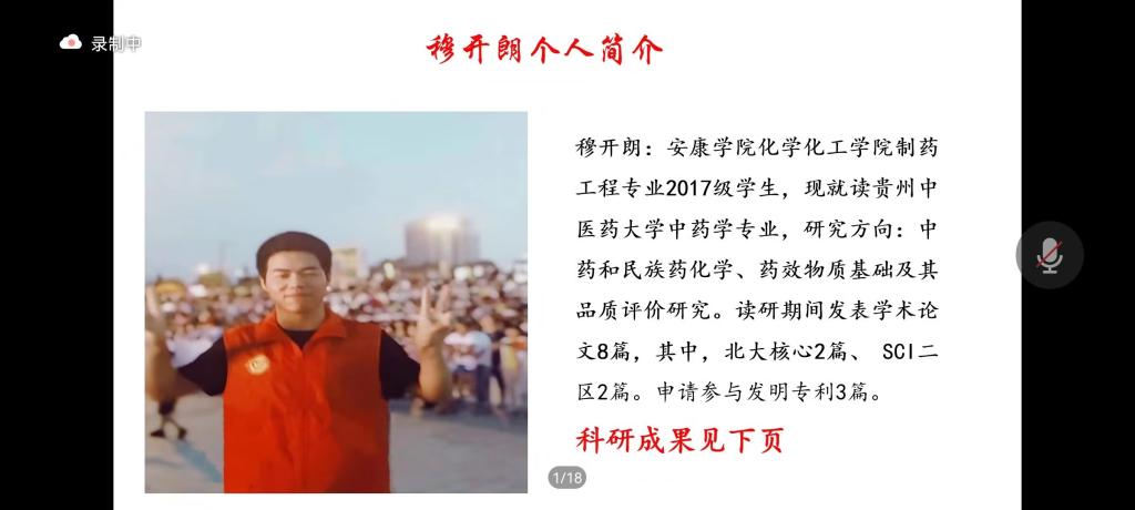 穆开朗,2021届制药工程专业毕业生,在校期间担任学院富硒检测中心助理,获得3次国家励志奖学金、省级优秀毕业生,以第一作者发表学术论文3篇,其中核心2篇,主持国家级大创项目1项,现就读贵州中医药大学中药学专业。