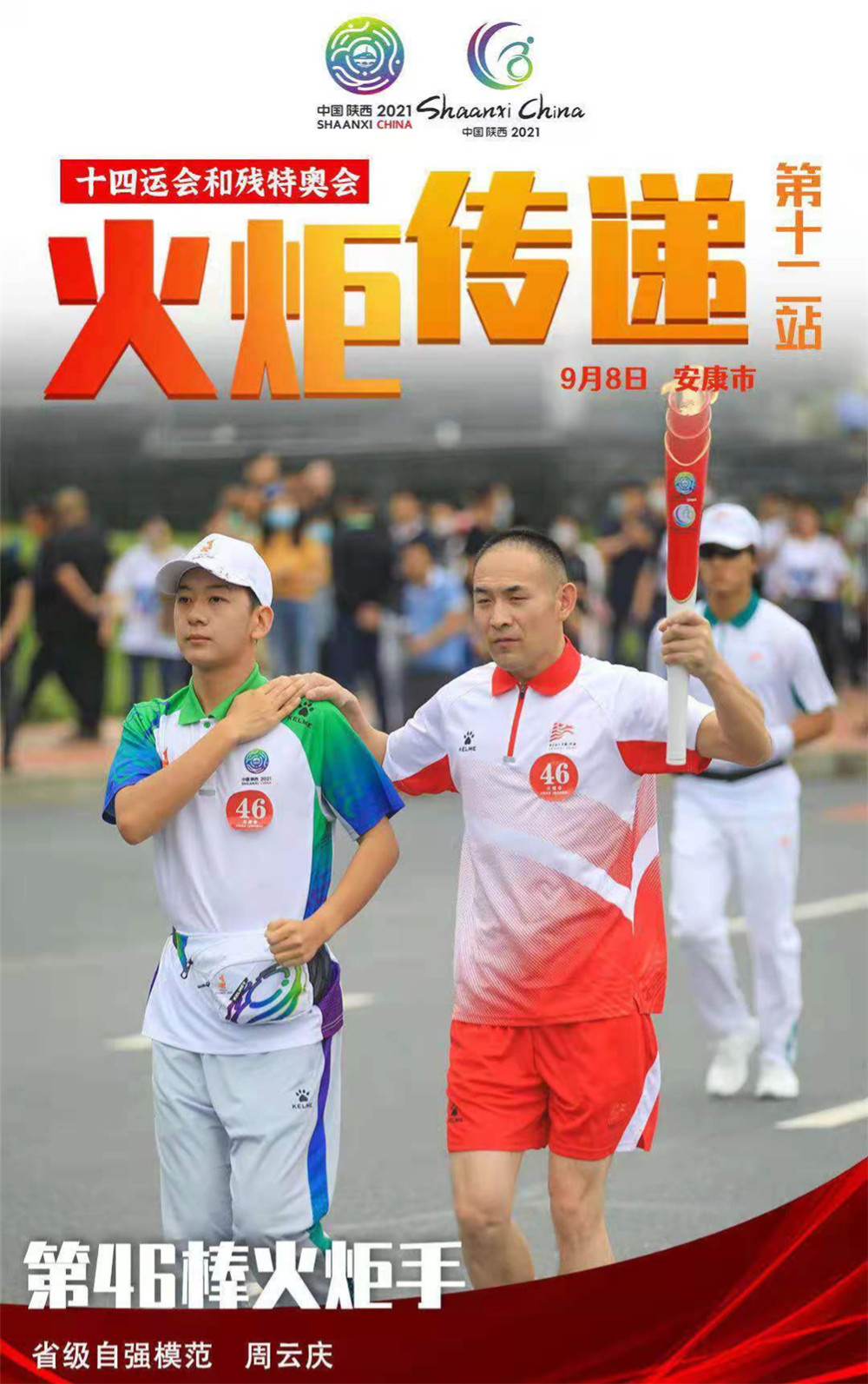 9月8日,中华人民共和国第十四届运动会、中华人民共和国第十一届残疾人运动会暨第八届特殊奥林匹克运动会火炬传递活动(安康市区站)在安康举行。9月5、6、7日,十四运会火炬传递先遣组对“小秦宝”们了进行岗前培训和全程演练。9月8日上午,圣火在安康市高新区传递,志愿者们凌晨五点半出发,到达火炬手入住酒店后,帮助火炬手领取火炬、号码牌、号码贴等物资,整齐划一的在火炬手投放车上等待和火炬手一起出发。在志愿服务过程中,每位志愿者都认真负责地坚守在自己的岗位上。
