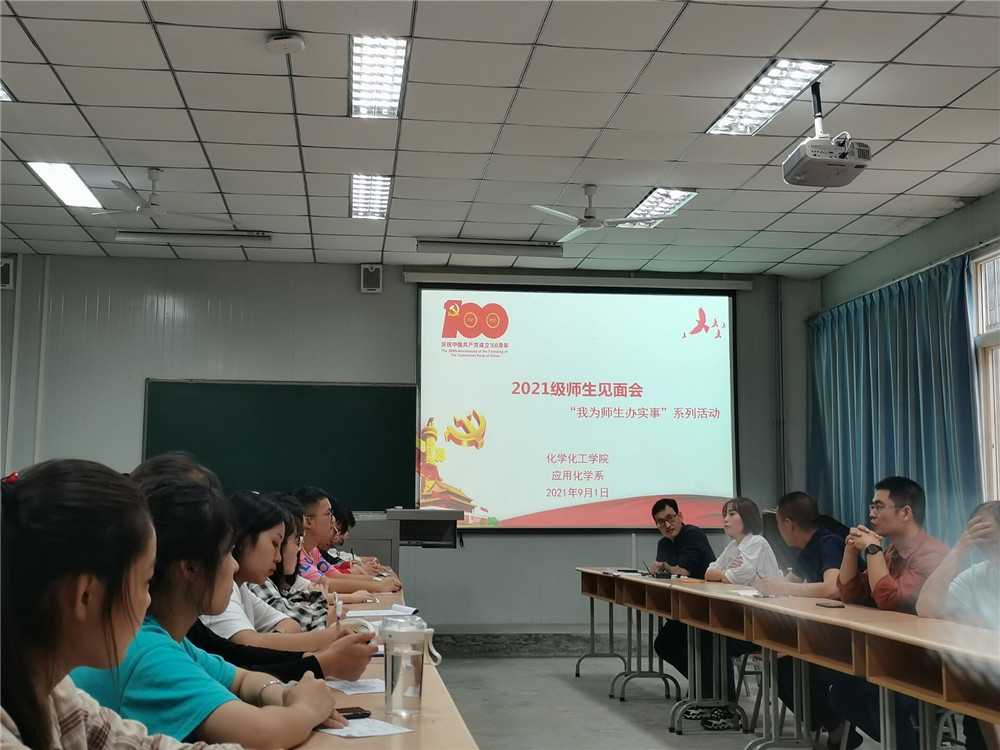 师生见面会上,张继东老师首先介绍了应用化学专业发展、师资情况、以及本专业往届学生就业考研情况。参会教师介绍了自己所带课程,科研方向和对新生的期望。师生互动环节,同学们踊跃提问,参会教师详细解答学生所提出的问题,耐心为同学们解惑。袁光辉副院长对我们学院5个专业进行了详细说明,给同学们讲解了考研究生的必要性和如何去准备。黄婷副院长给同学们介绍了学院第二课堂的设置,学业导师和科研社团的情况,鼓励同学们积极参与学科竞赛和各类科研项目。最后,王永东书记对本次活动做了总结,鼓励新生努力学习,会自己处理问题。殷切期望同学们能够志存高远,莫在大学里虚度光阴。集体活动结束后,由系主任张继东老师为同学们详细介绍专业相关情况。