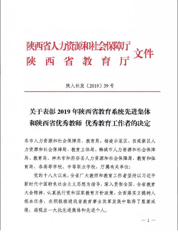 近日,陕西省人社厅、教育厅联合下发《关于表彰2019年陕西省教育系统先进集体和陕西省优秀教师 优秀教育工作者的决定》(陕人社发〔2019〕39号),beat365官网教师黄婷荣获“陕西省优秀教师”荣誉称号。