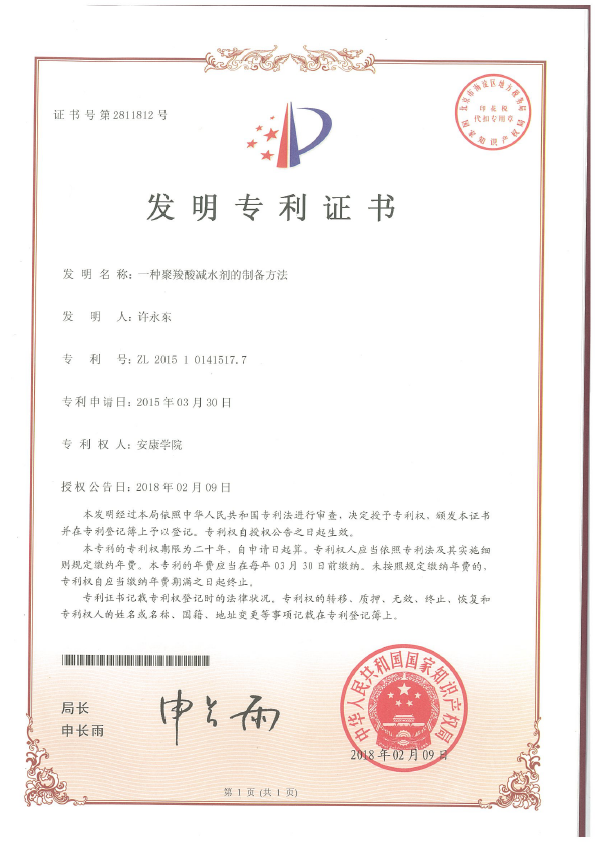 近日,beat365官网许永东老师的国家发明专利《一种聚羧酸减水剂的制备方法》(专利号:ZL201510141517.7)通过协议定价的方式成功实现转化,该专利围绕聚羧酸减水剂的制备,研究出了一种高效的方法,专利技术被企业采用。