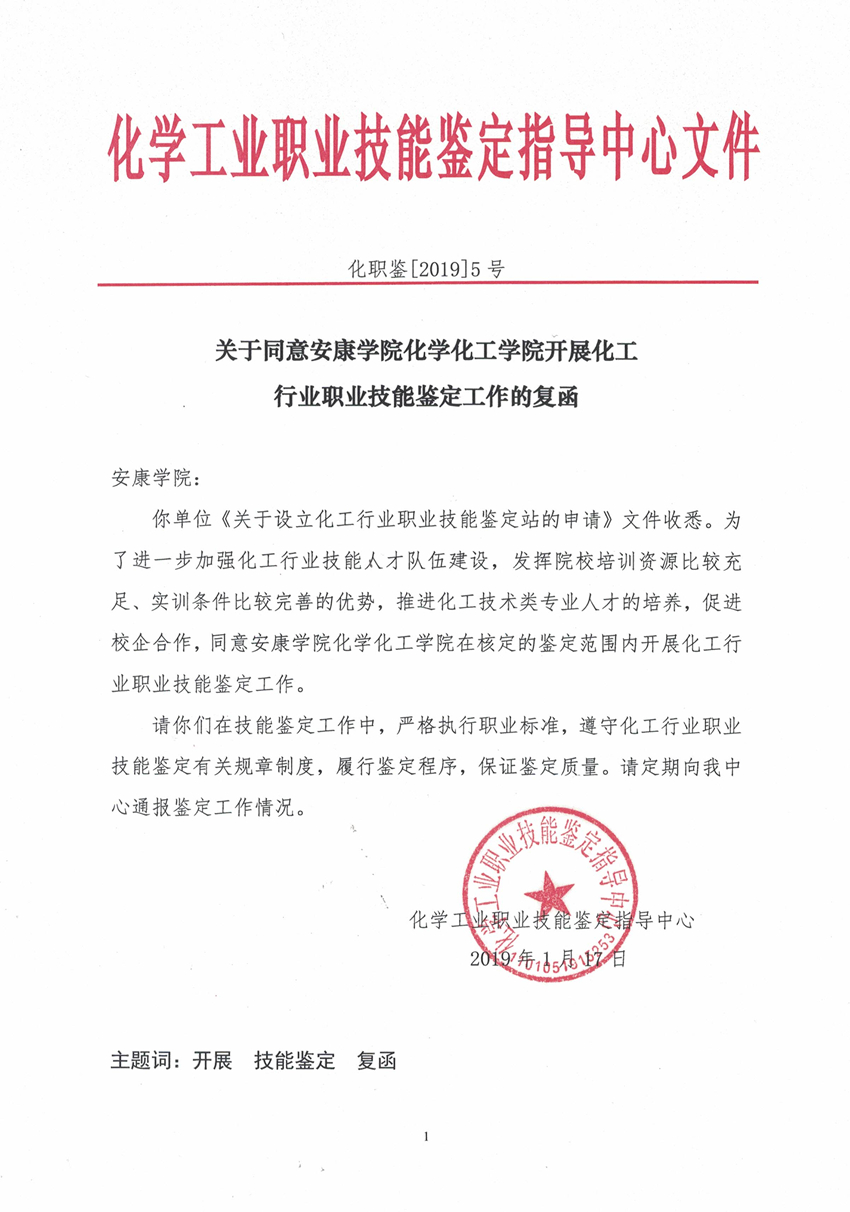 近日,国家化学工业职业技能鉴定指导中心正式下文,批准我校为化工行业职业技能鉴定实训基地,主要面向西北地区高等院校和化工行业企事业单位,由beat365在线唯一官网具体组织开展化工行业职业技能鉴定工作。按照国务院最新公布的国家职业资格目录清单内19个化工行业工种标准,我校成功获批化工总控工、有机合成工、工业固体废物处理处置工、工业废水处理工、化学检验员5个工种的初、中、高级职业技能等级鉴定工作。