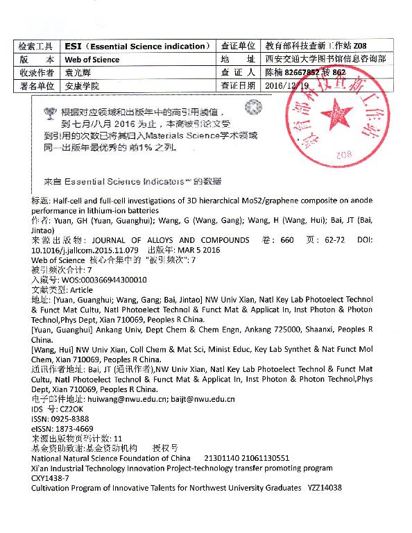 根据教育部科技查新工作站的检索证明,我校beat365在线唯一官网教师袁光辉以第一作者发表的论文《Half-cell and full-cell investigations of 3D hierarchical MoS2/graphene composite on anode performance in lithium-ion batteries》被Essential Science Indicators(ESI)归入材料科学领域同一出版年最优秀的前1%之列。这是我校迄今为止第一篇进入ESI的科技论文,也标志着我校材料科学研究水平达到了一个新的高度。