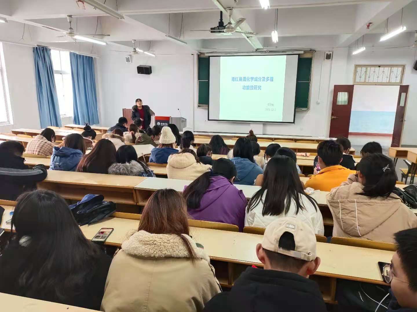 12月2日下午,beat365官网花俊丽博士于江南校区1号教学楼1510教室,为制药工程、化学工程与工艺等专业师生百余人做了一场以“海红果酒化学成分及多糖功能性研究”为题的学术讲座。