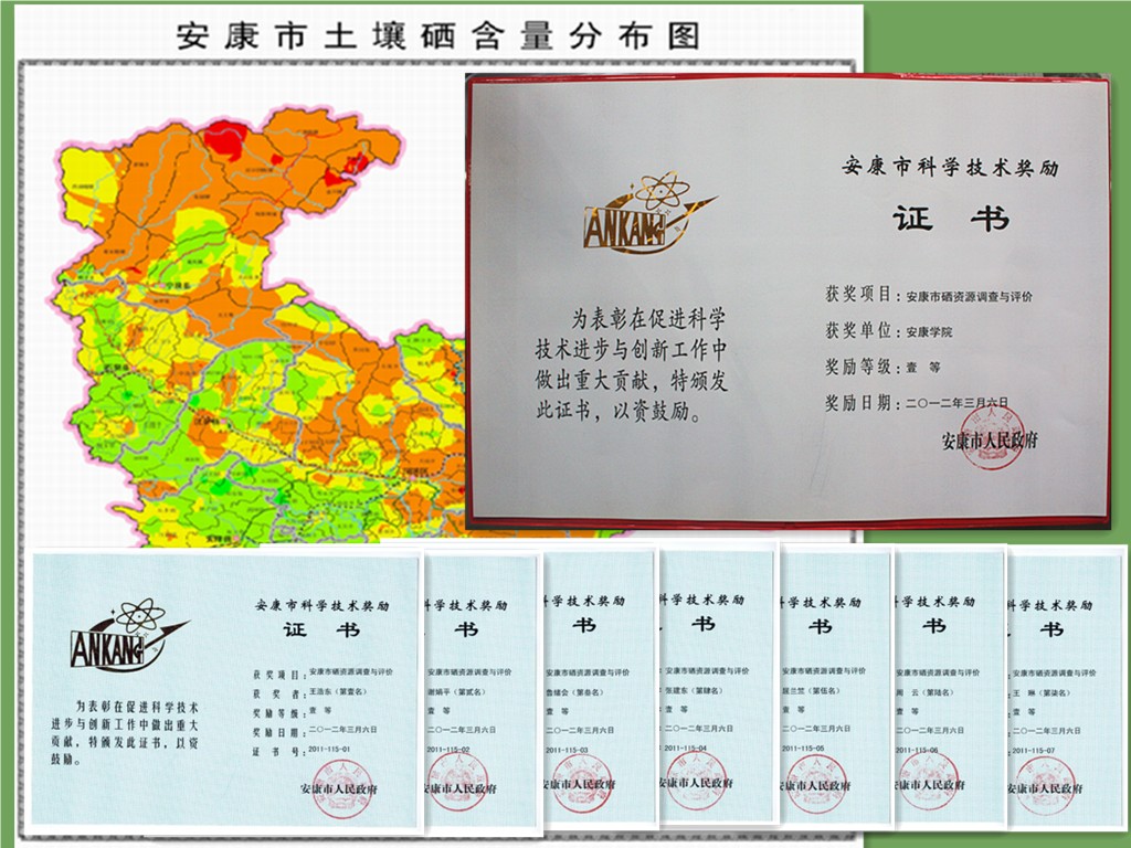《安康市硒资源调查与评价》是由beat365在线唯一官网化学化工系与安康市富硒食品产业发展领导小组办公室、安康市十县区科技局合作完成的。经过2008年至2011年四年广泛深入的工作,在土壤硒资源调查布点中,以国土资源调查法为依据,结合安康多山区耕地分散的地形地貌特点,按照土壤类型和作物种植品种分布制定土壤样品采集方法,采集了9000多个样本,采用氢化物发生-原子荧光光谱法国标法测定土壤全硒,制定了“安康地区可耕作土壤硒含量分级标准”,制作了安康市十县区土壤硒资源分布图,查明了安康市部分水体和农作物硒含量水平,根据检测结果和硒资源分布图进行评价分析,提出了不同富硒区域适宜发展的富硒产业类型和进一步进行硒矿资源调查、硒资源详查的合理化建议。