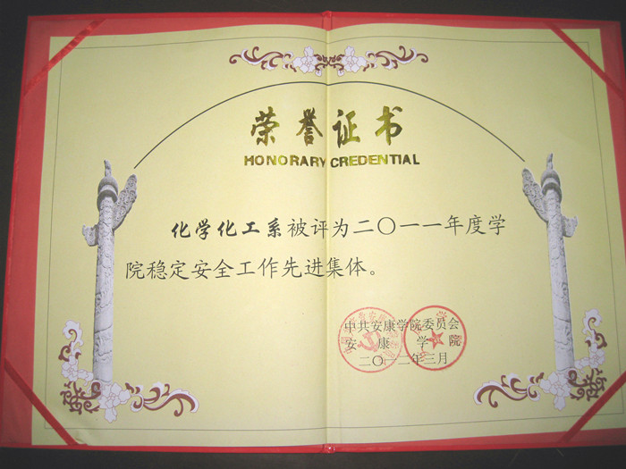 化学化工系被评为“beat365在线唯一官网2011年稳定安全工作先进集体”,教师屈兰竺、学生张卫东、刘可、芮晓兰分别被评为“先进个人”,这是学院对我系稳定安全工作的认可。