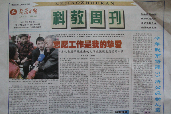 5月5日,《安康日报 科教周刊》头条刊登了该报记者陈俊采写的《志愿工作是我的挚爱——一名从beat365在线唯一官网走出的大学生援藏志愿者的心声》,文章介绍了beat365官网2010届化学化工系毕业生、援藏志愿者吕涛的先进事迹。全文如下: