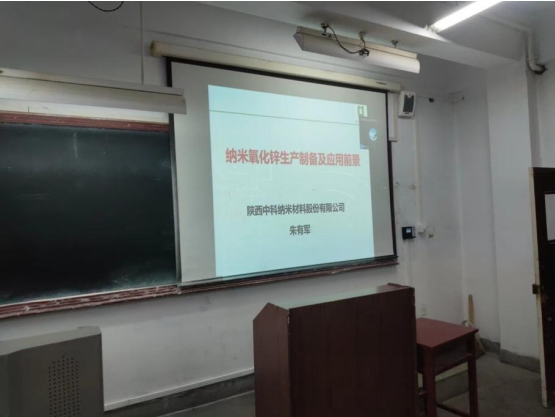 朱有军工程师首先介绍了企业的基本情况、发展历程和生产经营情况,接着对纳米氧化锌生产制备及应用前景做了细致的讲解,并向同学们提出了职业规划建议。