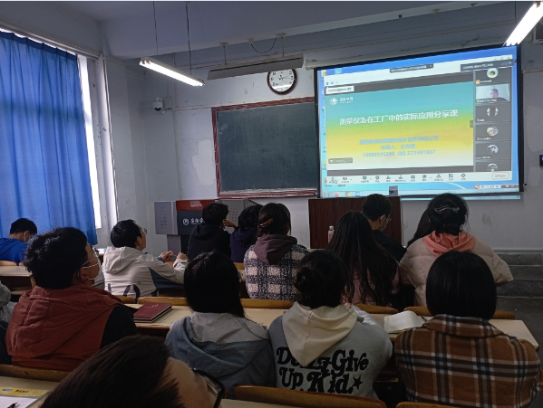 王利涛工程师首先介绍了企业的基本情况,接着对测温仪表、测压仪表、流量表计、液位仪表在生产制备及实际应用做了细致的讲解,并向同学们提出了职业规划建议。