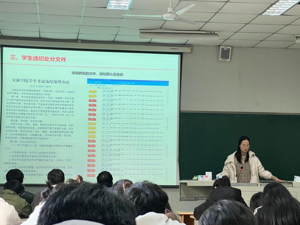 最后,按照学校《关于2022-2023学年第1学期期末课程考核工作安排的通知》要求,为严肃考风考纪,落实学院关于加强学风建设的要求。辅导员老师向同学们介绍了考试时间及相关要求,进一步明确了备考过程中的注意事项,并带领全体同学学习解读了《beat365在线唯一官网学生考试违纪处理办法》和《beat365在线唯一官网学士学位授予条例》,通过政策解读,提醒同学们端正考试态度,不要触碰校纪校规红线。同时,对学院考试违纪处分的学生情况进行通报,通过真实案例分享学生中存在的考试违纪事实以及相关处分,警示全体同学充分认清考试违纪的严重后果,戒除侥幸心理,坚决杜绝作弊行为。
