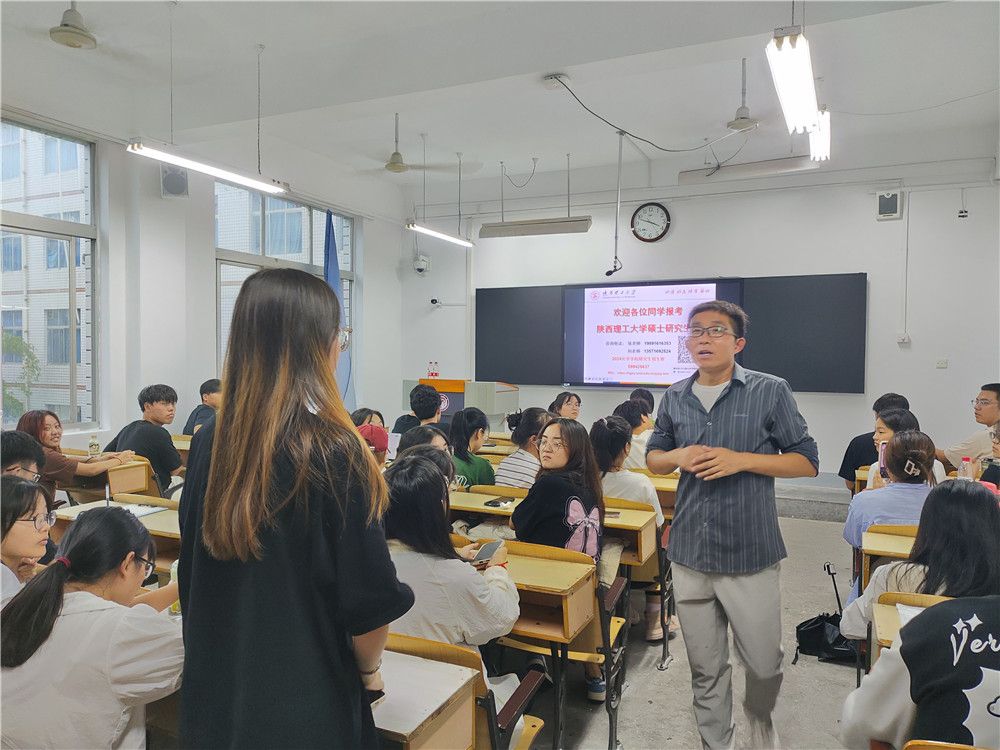 首先,陕西理工大学化学与环境科学学院的季老师从专业院校报考、课程复习规划、备考方法等方面给同学们进行了指导。接下来,季老师向同学们详细介绍了陕西理工大学的学科特色、师资队伍、科研成果、校园生活及就业情况,并对研究生招生政策进行了深入解读,为同学们申请及报考陕西理工大学研究生提供了完备的信息依据。最后,季老师亲切解答同学们在备考过程中的困惑,并表示非常欢迎化工学院考研学生报考陕西理工大学。
