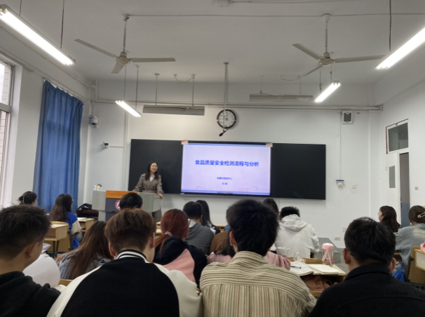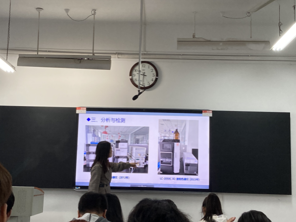 马倩在本节课为学生带来了一场题为“食品质量安全检测流程与分析”的专题讲座。马老师结合自己日常工作的实际案例,从采样、样品制备与处理、分析与检测、科学严谨结果的判定四个方面详细介绍了食品质量安全检测的全过程。同时,结合本课程内容,马老师重点介绍了萃取分离法中固相萃取、液液萃取和色层分离法中高效液相色谱在食品质量安全检测中的具体应用情况,加深了学生对理论知识的理解。