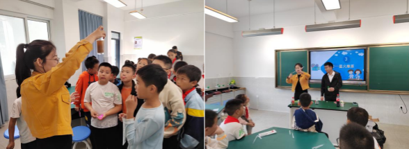科普活动以观察、讲解、体验、探究等多种方式,带领学生走进科学,去体验丰富多彩的互动实验,感受科学的氛围。首先,王雪老师以“什么是化学变化”为切入点,向同学们普及了生活中的化学知识。接着,王雪老师和金成召老师共同向同学们演示了“星火燎原”“魔法药水”等富有趣味性和观赏性的小实验。最后,由“化学之光”科普团其他成员,带领同学们完成了“无中生有”等趣味小实验。课堂内容丰富多彩,有趣的化学实验、新颖的教学方式给孩子们播下了科学种子,激起了同学们对化学知识的渴望。