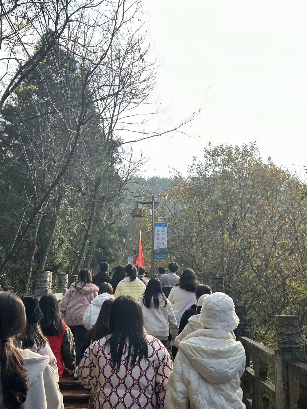 12月1日下午2点,全体学生在老师们的带领下从图书馆门前集合出发,一路上高举旗帜有序前进,旅途中大家欢声笑语,唱歌拍照,欣赏着香溪步道沿途的美景。历经一个多小时的徒步爬山后,全体师生到达了目的地。