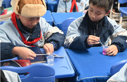 课堂上,王雪老师先带领同学们探索了一颗棒棒糖中蕴藏的神奇奥秘,再带同学们观察了小小紫甘蓝的各种搭配组合所发生的奇妙化学反应,最后以一个有趣的化学反应为同学们制作了一个限量的熔岩灯。在老师和科普团成员的共同引导下同学们也动手体验了每一个趣味小实验,同学们全程既惊喜又兴奋,紧跟王雪老师步伐,积极互动,沉浸其中,在课堂结尾还提出了许多自己困惑的问题,并表示期待我们的再次到来。