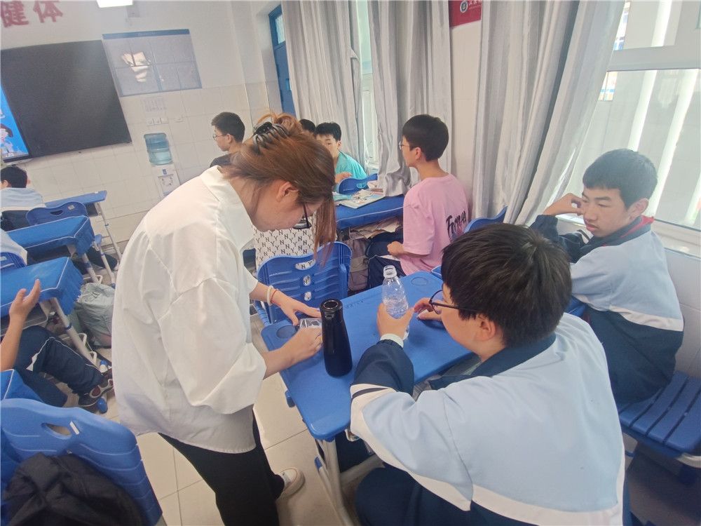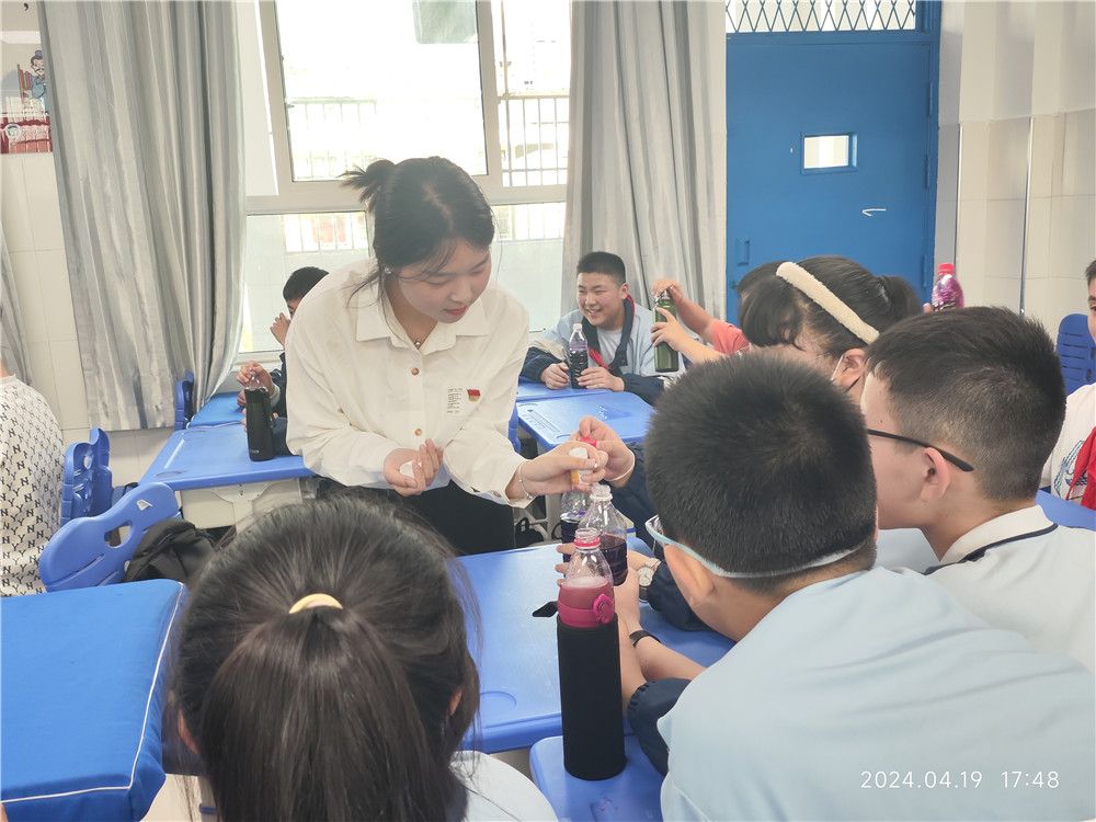 接着袁光辉、王晓林、王雪三位老师向同学们展示“掌中火”和“神奇的变色”两个富有趣味性和观赏性的实验,并邀请同学们上台亲自动手体验。最后,老师与科普团成员及学生党员们为同学们发放实验所需的高锰酸钾、vc片等实验用品,在三位老师的指导下,同学们一起摇动水瓶,观察水质变色的过程,感受化学反应的神奇魅力。实验过后,袁光辉向同学们解释原理,让同学们在实验中感受化学魅力,培养科学兴趣。