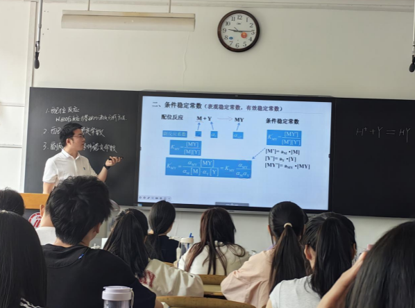 课上,金成召老师的授课课程是《无机化学与化学分析2》,主要讲解了配位滴定法概述、配位化合物的稳定常数、副反应系数和条件形成常数和金属指示剂这四部分的内容。教师精神饱满,生动阐述了教学内容,采用了启发和引导式的方法帮助学生理解相关知识,结合雨课堂的互动模式提高了学习的整体效率,课堂教学观摩活动圆满完成。