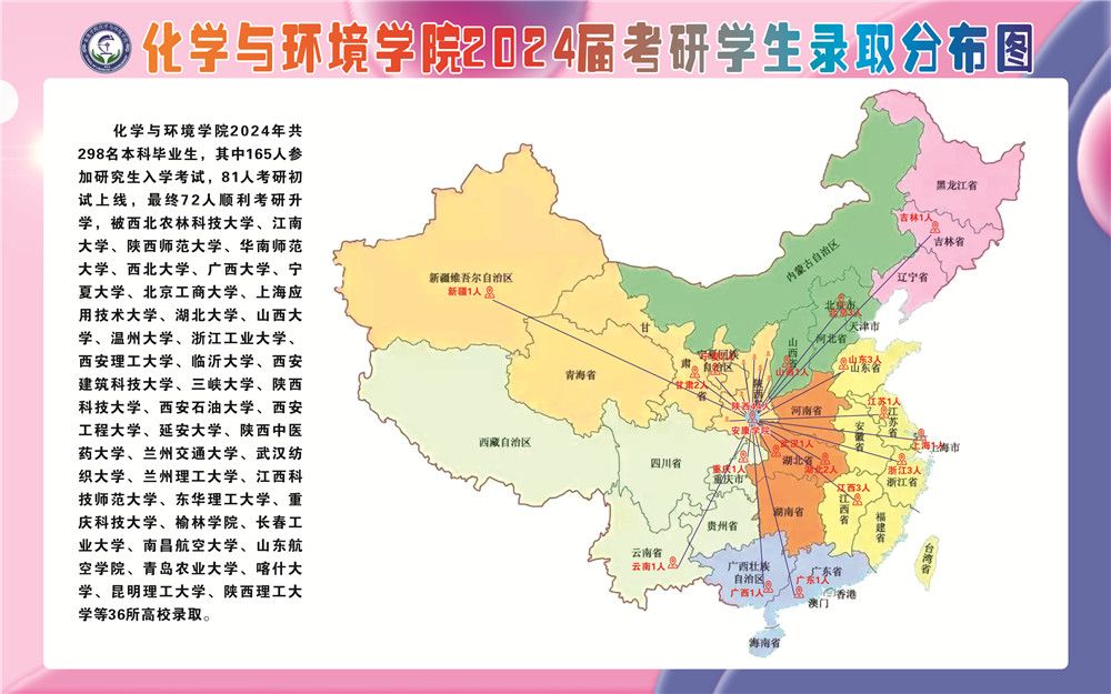 beat365在线唯一官网2024年共298名本科毕业生,其中165人参加研究生入学考试,81人考研初试上线,最终72人顺利考研升学,被西北农林科技大学、江南大学、陕西师范大学、华南师范大学、西北大学、广西大学、宁夏大学、北京工商大学、上海应用技术大学、湖北大学、山西大学、温州大学、浙江工业大学、西安理工大学、临沂大学、西安建筑科技大学、三峡大学、陕西科技大学、西安石油大学、西安工程大学、延安大学、陕西中医药大学、兰州交通大学、武汉纺织大学、兰州理工大学、江西科技师范大学、东华理工大学、重庆科技大学、榆林学院、长春工业大学、南昌航空大学、山东航空学院、青岛农业大学、喀什大学、昆明理工大学、陕西理工大学等36所高校录取。