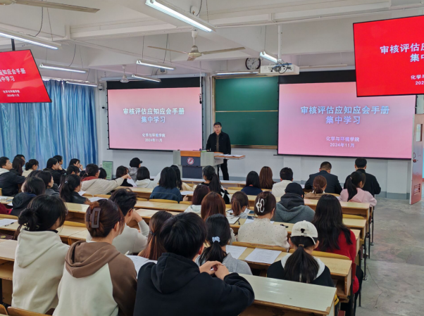 会上,于正豪老师重点解读了《本科教育教学审核评估应知应会》手册,介绍了本科教育教学评估的背景意义。围绕评估知识、校情校史、学院各专业人才培养定位等方面深入浅出的详细讲解。同时,会议还邀请了2022级应用化学1班学生代表付柯涛,围绕思想成长、学业进步、能力提升、职业理想、对学校的建议等方面,开展了“学生说成长”分享交流活动。