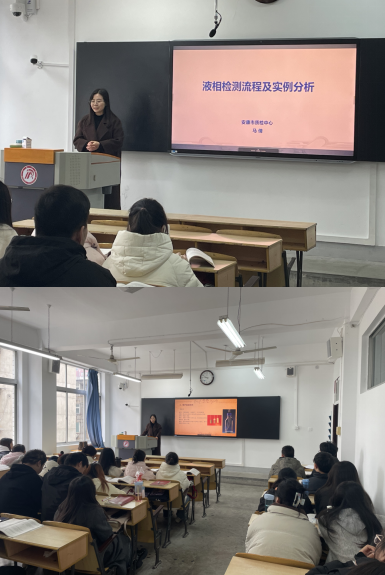 马倩工程师以自己日常实际工作为例,就食品分析检测的整体流程为同学们做了详尽的介绍分析,包括采样、样品制备、分析检测和结果评价报告。作为“全能型”的分析检测技术,液相色谱全面覆盖食品分析中营养成分、农药/兽药残留、添加剂/非法添加物、微生物毒素等多种指标的检测。马倩工程师将自己多年来从事液相色谱分析的宝贵经验无私地分享给在座各位同学,同学们仔细聆听,积极发问,收获颇丰。
