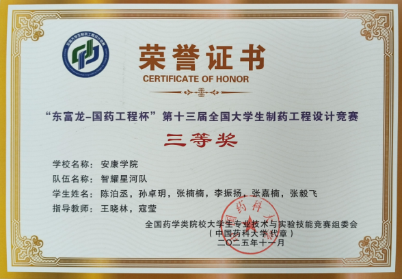 “全国大学生制药工程设计竞赛”是面向制药工程及相关专业学生的全国性高水平学科竞赛,旨在引导学生结合现代制药工业需求开展工程设计实践,提升工程创新能力与团队协作能力。本次获奖展现了我校在制药工程专业人才培养方面的扎实功底和教学成效。